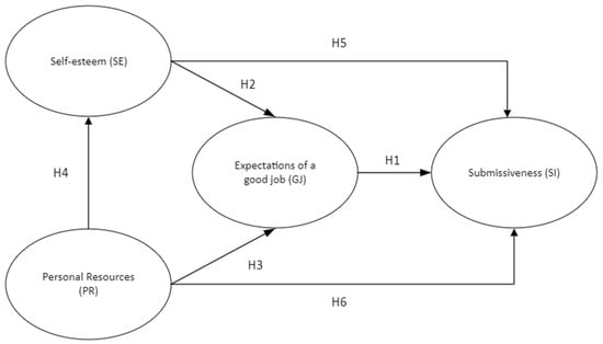 The previously analyzed indexes became the basis for the creation of latent constructs expressing the four dimensions: self-esteem, personal resources, good job, and submissiveness. These dimensions allowed for the creation of reflective indicators for latent variables. The exogenous group of latent variables were the SE and PRs variables and the endogenous groups were the GJ and SI variables. All of these were determined via explicit variables. The SEM model assumes that there were reflective relationships (confirmed by the results of the tetrad analysis; see Bollen and Ting 2000). This means that the explicit variables are a reflection of the latent variables.