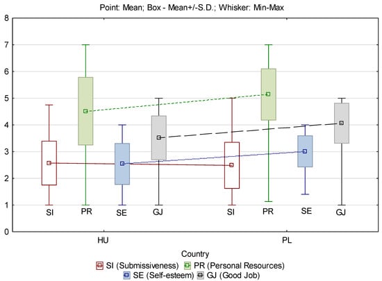 The mean value of self-esteem was higher among those who have children (2.90) than in the group without any children (2.66). This may be due to the treatment of children as a reference point in the statements being assessed (thus making having children the “background” of one’s own assessment—see the statements in Table S1. Referring to the submissive index, it is worth noting that the mean value was higher in the group with no children. This means that those refugees who are responsible for children want a job that enables them to care for children and reconcile work and family life.