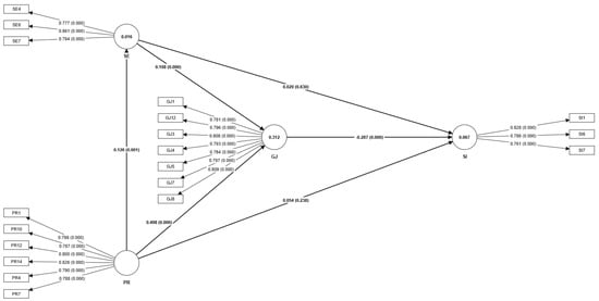 After performing the exploratory factor analysis, the following indicators were included for further analyses of all four variables (these contributed the most to the reliability of the analyzed constructs): for PRs—PR1, PR4, PR7, PR10, PR12, and PR14; for SE—SE4, SE6, and SE7; for GJ—GJ1, GJ3, GJ4, GJ5, GJ7, GJ8, and GJ12; and for SI—SI1, SI6, and SI7.