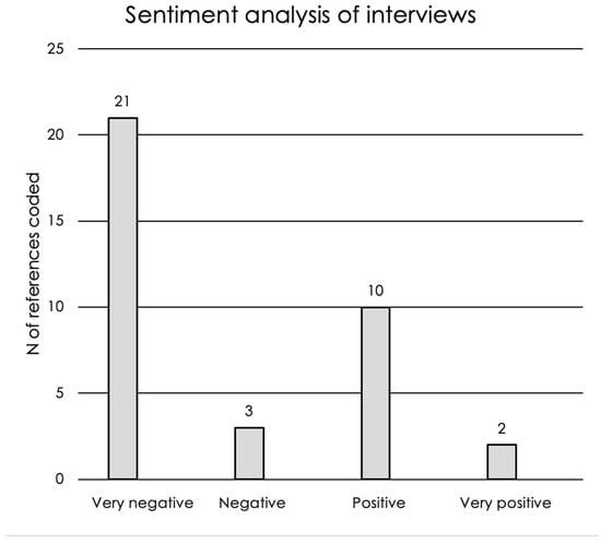 After analysing nearly 30 h of audio and synthesizing the interviews into 20,000 words that best addressed the objectives of this research, three fields were configured based on the interviewees’ experiences. These fields later converged into an approximation of an urban planner’s habitus in a neoliberal context for different typologies. It is anticipated that there has been a certain level of convergence in most of the actors’ interpretations of the proposed fields. However, the divergences found allow for a more nuanced understanding of the habitus, which will later be used to construct the typologies. As part of the coding process, it was found that the sentiments when discussing these topics were mostly negative, meaning the emotional charge of the phrases and arguments stemmed from feelings of powerlessness, pessimism, and even anger in some cases (Figure 2).