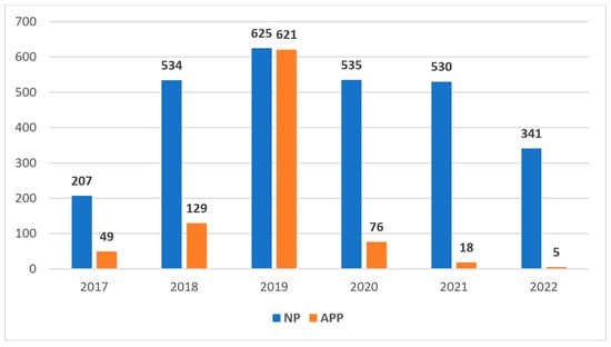 The fanpages have similar trends of expansion and retraction in the content creation process. The year 2019, for instance, stands out as an outlier in the sample, accumulating the highest gross number of messages in both cases: NP (n = 625 | 22.5%) and APP (n = 621 | 69.2%). On the other hand, the Covid-19 pandemic, responsible for reinforcing the digitalization dynamics of life in society, does not appear to have accelerated the workflow of fanpages.