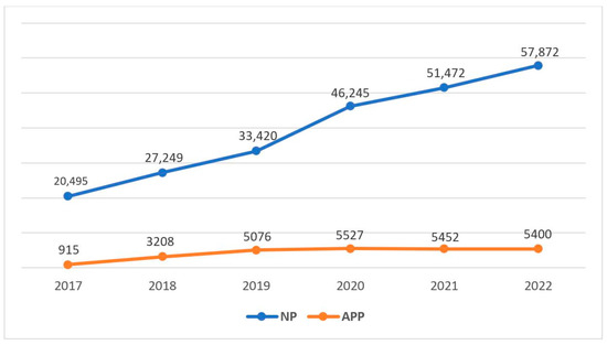 Figure 2 shows the growth of fanpages analyzed over the years. Productive activity may have driven the increase in followers, although this growth has not always been consistent. The data also reveal periods of slight contraction. NP recorded a total growth of 129.9%, with 2020 standing out as the year with the most significant productive flow, showing a 33.3% increase in followers. Once again, the COVID-19 pandemic does not seem to have had a significant impact. This phenomenon is also evident in the APP. With a total growth of 320.6%, the most significant increases were observed in 2017 (132.5%) and 2018 (135.2%), respectively, thanks to the expansion of the fanpage in its early years.
