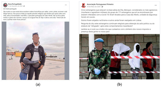 Emotional reactions represent around 12.5% of the sample’s interactions. However, the fanpages have the opposite results. Posts by NP, based on homeland and past imperial pride, have more Love over time (69.9%). On the other hand, content by APP, focused on anti-immigration, mobilizes more Angry (60.9%). The point of convergence is the Sad reaction. The fanpages are almost evenly matched, at 12.0% each. The opposition of these reactions and, at the same time, their strange proximity can be summarized in a maxim: One’s heaven can be another’s hell. Figure 3a,b shows the posts with the highest Love and Angry reactions, expressing this ambiguous conflict of affection and repulsion. People’s faces have been blurred to safeguard their personal data and images.