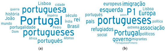 On the other hand, the ten most frequent words on APP are portugueses (599), P1 (450), Portugal (302), esquerda (203), Europa (199), imigração (175), governo (171), associação (160), refugiados (148), and país (147). These terms are used to directly attack immigrants, left-wing parties, and the political actions of the socialist government. The image of foreigners is constructed as a national and European threat, especially those from the former colonies (see Figure 4b).