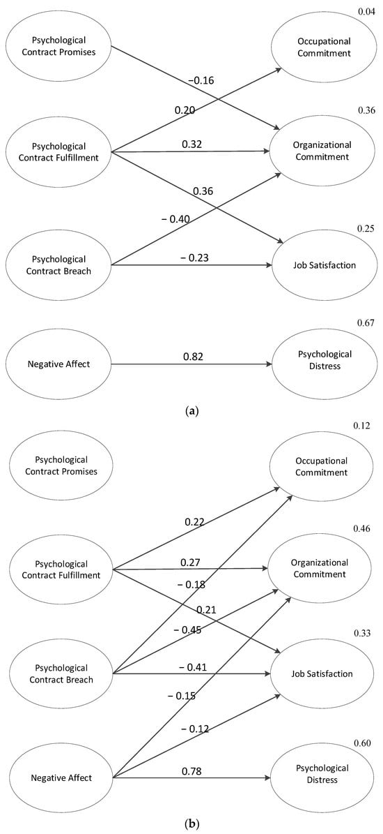 The analyses investigated psychological contract promises, fulfillment and breach, with negative affectivity, on the work, occupation and distress variables (job satisfaction, psychological distress, occupational commitment and organizational commitment). Although partial invariance testing between the groups may have been possible, the value of such testing is still debated in the technical literature and, more importantly, would not be appropriate given the inability to specify any major model differences a priori (see () for further details and introductory discussion). The delineation of the possible effects of specific contextual issues such as occupational prestige is too novel to specify the expected differences between models.