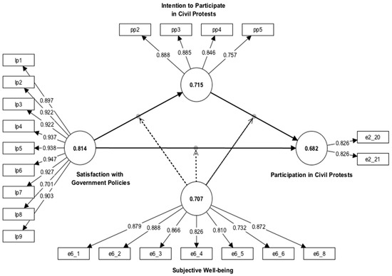 Concerning reliability, Cronbach’s alpha for “Intention to Participate in Civil Protests” was particularly strong (0.866), and its composite reliabilities (rho_a = 0.872, rho_c = 0.909) further supported its internal consistency. “Satisfaction with Government Policies” and “Subjective Well-being” also showed exemplary reliability with Cronbach’s alphas of 0.971 and 0.930, respectively. In contrast, “Participation in Civil Protests” had a notably low Cronbach’s alpha (0.534). However, it is important to note that this construct consisted of only two items, which often results in underestimating reliability when using Cronbach’s alpha. Despite the low alpha value, the composite reliability was satisfactory (rho_c = 0.811), implying that the construct may still be reliable.