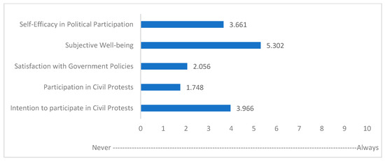 Mediating Variable: Intention to Participate in Civil Protests. The mediating variable, “Intention to Participate in Civil Protests”, captures the willingness of individuals to engage in demonstrations or acts of civil disobedience. This was measured using a 10-point scale with questions about the respondent’s likelihood of participating in protests. Questions included How likely will you eventually participate in any of these civil demonstrations? How likely will you participate in these non-governmental or civil society independent groups? How likely can you share your genuine political opinions using social media or the internet? How likely are you to share your genuine political opinions in your neighborhood?