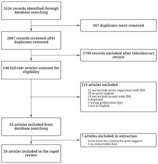 Following a full-text review, 33 articles that described peer support for people with intellectual and developmental disabilities were retained. During the extraction process, researchers eliminated another seven articles, as one article did not have any extractable data (n = 1) and the remaining six did not meet the criteria for peer support (n = 6), as there was no intentional interaction between peers (e.g., those using pre-recorded videos of a peer modeling a target behavior or outcome). The final review included 26 full-text articles.
