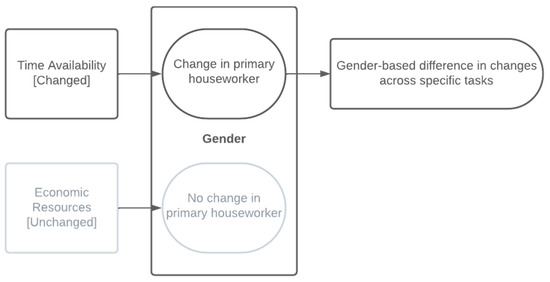 If economic resources were the dominant factor affecting the division of household labor, we would expect to see minimal changes between genders in this context. In other words, any observed changes in the distribution of domestic responsibilities can be more clearly attributed to available time variations (see Figure 1). Gender, furthermore, may serve as a critical determinant in how these task redistributions manifest differently among men and women across different types of chores.