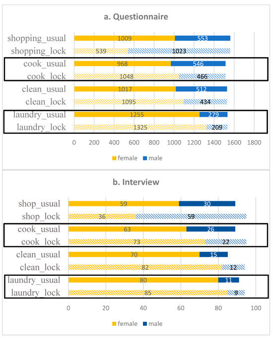 A mixed-method approach, combining a survey and interviews, was adopted to ensure the inclusivity of diverse household arrangements. The survey used a broad conceptualization of family, categorizing members by gender. The central questions of the survey (see Appendix A Table A2) aimed to explore the gender-based division of general housework and specific tasks to identify shifts during the lockdown period. However, it is important to note that this qualitative approach may not fully capture instances where changes in responsibilities were equally distributed between genders (e.g., mutual increases or decreases in tasks). To mitigate reporting bias stemming from social desirability, the survey options designated either female or male family members as the primary contributors to household labor. All other arrangements, including those involving an equal division of tasks, were categorized under “Others” and were subject to text-based follow-up for further clarification (Geist and Cohen 2011; Kan 2008).