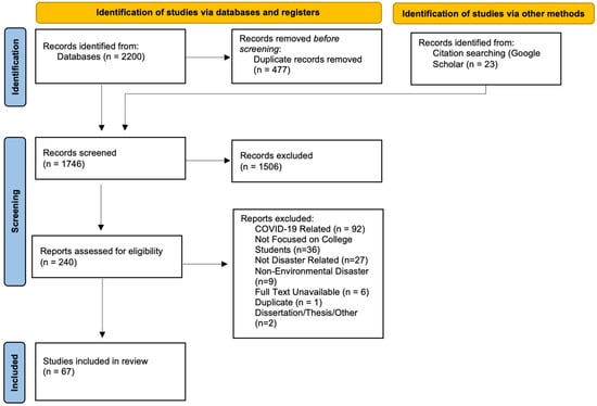 For the full-text review, the first two authors independently read through the full texts to determine whether the publications met the inclusion or exclusion criteria (Table 3). One of the key exclusion criteria for this review was any mention of COVID-19. We excluded COVID-19 studies in order to gain an understanding of the current scope of environmental disaster research specifically focused on college students. Any disagreements were discussed between the first two authors until a final decision was made on the publication’s validity. The proportionate agreement for the full-text review was 0.895 and the Cohen’s kappa statistic was 0.732. The full-text review process removed a total of 170 publications leaving a total of 67 publications for extraction. Extraction was carried out in the Covidence system, where metadata about each of the articles (e.g., title, DOI, disaster type discussed, etc.) was collected by the first and second authors independently. After reaching a consensus on the metadata, the data were exported into a CSV for quantitative analysis.