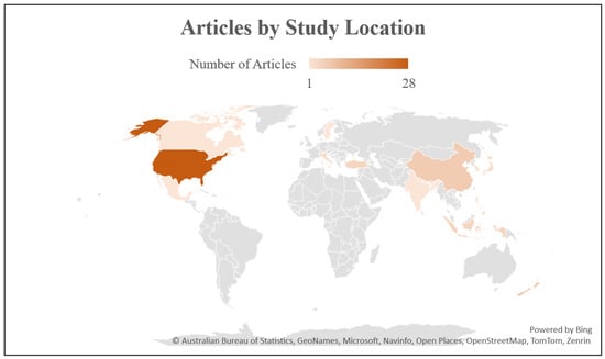 For the quantitative analysis, we analyzed the descriptive statistics compiled during the extraction of the metadata in the 67 publications. For each of the articles, we collected the geographic locations of each of the studies to determine if there were geographic location gaps in the research. We found that the United States has the most publications with 28, followed by New Zealand (7), China (6), Turkey (4), and Indonesia (4). Figure 2 shows the fully mapped distribution of the articles. This distribution indicates the vast disparity between research on college students and environmental disasters. In our review, South American, Australian, and African research was non-existent. Even taking into account that the United States had the most articles on college students and disasters with 28 in the past ten years, the number of billion-dollar environmental disasters is rising () and there were 92 articles excluded in the full-text review for being COVID-19-related. This means there were more than three times as many articles written about COVID-19 and college students in half the time frame. This justifies the need to conduct further research on environmental disasters and college students.