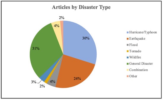 In addition to the geographic location of the articles, we were also interested in what types of environmental disasters were the focus when examining them in the context of college students (Figure 3). Our data showed that articles referred to disasters in the most general sense nearly a third of the time (31%). Hurricanes were the second most commonly discussed disaster (30%), with earthquakes as the third most common (24%). On the other hand, tornadoes, floods, and wildfires only made up 9% of the studies reviewed—there was one study on tornadoes (), two studies examining wildfires (; ), and three focused on floods (; ; ). Finally, three studies focused on a combination of disaster types (; ; ). For example, () examined medical student involvement and psychological impacts following the typhoon and earthquake in Fukushima, Japan, in 2011 finding those who had volunteered experienced higher post-traumatic growth. In addition, () interviewed community college students who experienced Hurricane Harvey and the subsequent flooding in 2017, and found that students relied heavily on advisers and institution members to assist with navigating their post-Harvey academics. As compounding and cascading disasters become more common in the future, these studies will serve as the precursor to research regarding college students facing numerous disasters while in school.