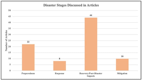 In terms of what disaster stage publications examined, the recovery stage was discussed the most often in articles (Figure 4). This was due, in part, because we coded post-disaster impacts as part of the recovery stage. Forty-four of the sixty-seven total articles discussed recovery or post-disaster impacts. Comparatively, preparedness was the second most common stage discussed in the articles but with half the total compared with the recovery stage. We coded for mitigation in 10 articles. However, mitigation was often closely aligned with disaster preparedness. For example, several studies tested students on their preparedness knowledge outside of the context of a specific disaster event (; ; ). These studies not only addressed students’ personal preparedness knowledge but also provided crucial information to the universities on how to better mitigate against negative impacts on students and their families. Finally, the least examined disaster stage is the response stage. The lack of research focused on disaster response might be expected—especially in a population as specific as college students—because of the sheer difficulty and rapid nature of conducting research within the context of an acute environmental disaster ().