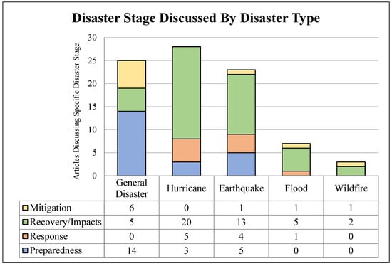 To further understand the landscape of the current literature and to gain a more granular view of the research conducted on disaster type and disaster stage, we analyzed what stage of disaster occurred most frequently within the research on disaster type (Figure 5). Our analysis showed that within the “general disaster” category, the major focus was research on generalized preparedness to mitigate against negative impacts. Meanwhile, when discussing specific environmental disasters, the recovery stage along with the associated post-disaster impacts made up the largest proportion of the study topics. For example, in hurricane-related research, recovery and post-disaster impact studies represented approximately 71% of the publications. This trend held for earthquakes (57%), floods (71%), and wildfires (67%).