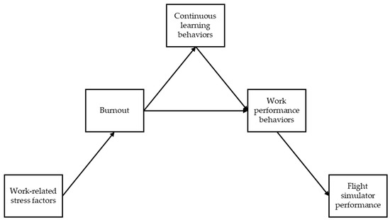 Work-related stress factors are indirectly related to flight simulator performance via the sequential mediation of burnout, continuous learning behaviors, and work performance behaviors.