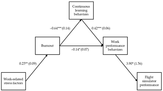 Bootstrapping procedures with 5000 resamples were used to test the mediation effects. The indirect effect of work-related stress factors on flight simulator performance through burnout, continuous learning, and work performance behaviors was negative and statistically significant (−0.27, SE = 0.16, 95% CI = −0.21; −0.05). The specific mediating role of continuous learning behaviors was confirmed by the significant indirect effect of burnout on work performance behaviors (−0.26, SE = 0.05, 95% CI = −0.37; −0.17). Additionally, the indirect effect of burnout on flight simulator performance through continuous learning and work performance behaviors was negative and significant (−1.05, SE = 0.49, 95% CI = −2.09; −0.14). The examination of the R2 revealed that the estimated model accounted for 13% of the variance in burnout, 33% of the variance in continuous learning behaviors, 47% of the variance in work performance behaviors, and 6% of the variance in flight simulator performance.