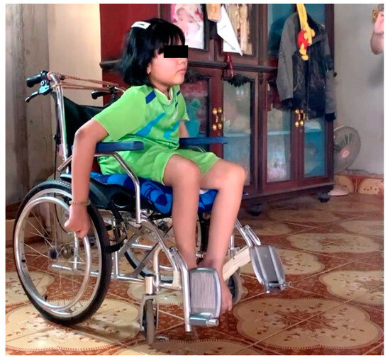 Table 4, along with Figure 1 and Figure 2, presents the levels ADL and the living conditions for Participant A. Participant A lived with her parents and older brother, and her grandmother’s sister and other relatives lived next door. As of March 2023, she was not enrolled in school, so she spent most of her time at home during the day, either in a wheelchair or sitting on the floor, watching TV, playing mobile phone games, and drawing pictures. She could move her wheelchair by herself, but very slowly. She attended the SEC’s district learning center about once a week for rehabilitation, and another part of her daily routine was to self-propel her wheelchair, which she was granted in August 2020, to her next-door relative’s house. When she goes out to the local temple or shopping center, she rides the side car of a motorcycle driven by a family member while sitting in her wheelchair. When she had not started school, her mother taught her to read, write, and perform simple mathematics at home. She could sit in her wheelchair for approximately two hours at a time. Although she does not feel pain, her legs become edematous after sitting for long periods. The frequency of transfers was 2–3 times per day. She can sit up and relieve pressure on her own; however, her mother assists her in all the transfers and getting in and out of her wheelchair.