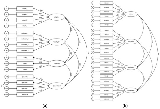 In ReTrab, three items (2c, 1d, and 5c), corresponding to the “func_3”, were removed (see Figure 2a) due to saturation levels below 0.45 (Brown 2006). These items were part of the emotion-expression dimension, which was eliminated from subsequent analyses. As a result, the functional factor included only items from attentional deployment, situation modification, and situation reassessment. In MDMQ, items 1 and 4 were removed (see Figure 2b) due to saturation of 0.30 and 0.41, respectively (Brown 2006). These items were part of the vigilance and buck-passing dimensions, reducing each from six to five items. Notably, they were excluded from the subsequent analyses. The modification indices suggested improved model fit by covarying two errors (e14 and e15).