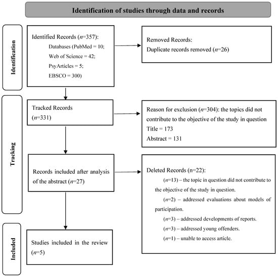 The analysis of the articles in question went through two phases: the first corresponded to the reading and analysis of the title and summary of each article, and the second included the full reading of the articles selected from the first phase, meeting the inclusion and exclusion criteria mentioned above. Initially, 357 articles were found, and then duplicate articles were eliminated. Thus, 331 articles remained, and 26 articles were removed. The titles and abstracts of each of the articles were then read and analyzed, with 304 articles with themes that did not contribute to the objective of the study in question being excluded. The full text of each article was then read, eliminating articles according to the inclusion criteria and exclusion criteria. At this stage, 22 articles were excluded from this study because they did not meet the criteria previously defined, such as the following: not focusing on the topic in question; focusing on evaluating participation models; focusing on carrying out social reports; focusing on young offenders; and not being able to access the article.