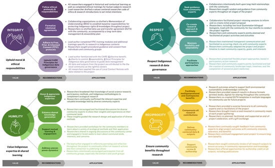 Integrity: We recommend that institutions, agencies, and governing bodies formalize an Indigenous rights-based practice for engaging with Indigenous Peoples in research that aligns with UNDRIP, such that protocols and mechanisms are made transparent to both institutional affiliates and community research partners with dedicated and informed support staff. These efforts should include identifying clear pathways to support Indigenous data governance and data stewardship (Carroll et al. 2022) as well as strategies for incentivizing community-driven outcomes. We also recommend that all researchers consider the time and resources it takes to implement ethical procedures when crafting project timelines.