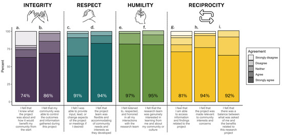 To broadly assess the alignment of the overall project process with the RSM principles, Figure 2 outlines key reflections that correspond to each of the four RSM core values of integrity, respect, humility, and reciprocity, each of which demonstrated high agreement (agreement percentage ranging from 74 to 97%; Figure 2). Statements that reflected the value of integrity received the lowest level of agreement, though the majority of respondents still felt that their community was able to control the outcomes and information gathered during the project (86% agreement, n = 35) and that they knew what the project was about and how it would benefit their community from the start (74% agreement, n = 35). This lower level of agreement could indicate that more effort could have been dedicated towards engaging community research partners at the onset of the project, prior to initiating field project activities. Related to the value of respect, respondents largely agreed with feeling that the project team was flexible and accommodating of community needs and interests as they developed (95% agreement, n = 36) and feeling that they were able to provide input, lead, or change aspects of the projects or meetings if desired (91% agreement, n = 34). Statements that reflected the value of humility received the strongest agreement from respondents, which included feeling listened to and honored in their interactions with the research team (97% agreement, n = 33) and feeling that the research team was genuinely interested in learning from them and about their community or culture (94% agreement, n = 36). Lastly, regarding reciprocity, the respondents largely felt that the project was made relevant to community interests and concerns (94% agreement, n = 35), that there was a balance between what was asked and the benefits of the project (92% agreement, n = 35), and that they were able to access information and findings related to the project (81% agreement, n = 31).