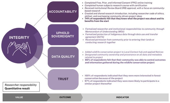 Figure 3. Evaluation indicators of outcomes related to the value of integrity. The four potential outcomes arising from the core value of integrity, as presented in the Relational Science Model. Included in the evaluation indicators are external researcher responsibilities (italicized) and quantitative results (in bold, from Figure 2 and Figure 4) binned by each of the outcome criteria.
