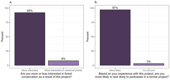 Figure 4. Post-project community perception. (a) shows the percentage of community respondents who are more interested in forest conservation (or medicinal plants, specifically) following the project. (b) shows the percentage of community respondents that are more likely or less likely to participate again in a similar project.