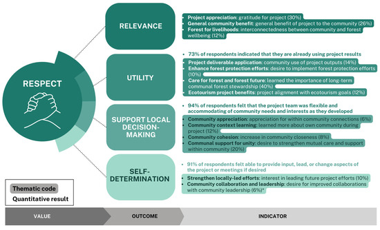 Figure 5. Evaluation indicators of outcomes related to the value of respect. The four potential outcomes arising from the core value of respect, as presented in the Relational Science Model. Thematic codes (in bold and highlighted) are binned by each of the outcome criteria, including brief descriptions and the proportion of respondents who mentioned each thematic code in parentheses. Asterisks (*) denote codes that infer a critique or area of improvement within the project (Table S2). Included, where relevant, are complementary quantitative results (in bold with no background, from Figure 2 and Figure 6).