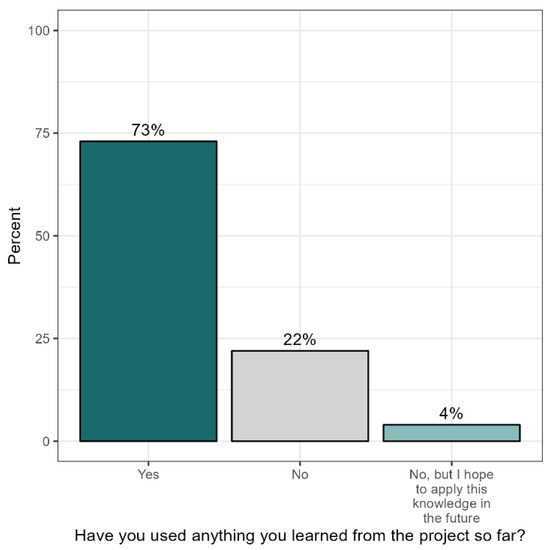 Regarding the RSM core value of respect, four central outcomes arise, including project relevance, utility, and support for local decision-making and self-determination (David-Chavez et al. 2024). Regarding project relevance, several respondents voiced general project appreciation and community benefits, including noting how supporting forest conservation could support livelihoods as well, with one respondent noting, “We need to protect the forest. Without forest, there is no source of water or animals. The forest regulate[s] the weather and they provide food” (Figure 5). By intentionally making research processes relevant to community interests and goals, this led to a high degree of utility, with nearly three-quarters of community research partners already using project results after merely three months following the conclusion of the project (n = 33; Figure 6), with one respondent stating, “What this left us is something visible, for example the recipe book, [and] the pictures of the animals of the forest”, and another noting, “For the future, my family could get benefit through an ecotourism project. [This] could be a way to open this possibility”. Of those not yet using project results (27%), 4% are hoping to use project results in the future (n = 12; Figure 6), with one respondent commenting “The projects you have brought to us have been very good. I couldn’t participate but I would like to in another opportunity”.