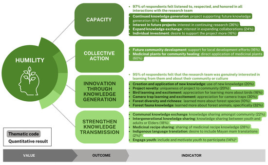 For the RSM core value of humility, outcomes encompass increased capacity, collective action, innovation through knowledge generation, and the strengthening of knowledge transmission (David-Chavez et al. 2024). In particular, implementing principles of humility yielded increased capacity and collective action of community research partners through the diverse methods employed during the research process (Figure 7). Results related to capacity demonstrated strong ties to the potential for extending knowledge transmission within the community, with several respondents noting the desire for, interest in, and intention of continuing to create new knowledge within the community, developing future projects, and expanding knowledge exchanges to include more of the community or other communities, with one respondent commenting, “I would like to share more knowledge about the forest and medicinal plants” (Figure 7). Some respondents also commented on a personal interest or desire to engage in the project further. Regarding collective action, several respondents noted how this project and future projects might contribute to community development, with one respondent noting, “The community improves as we improve as well. The nature preserves”. Additionally, related to collective action for strengthening knowledge transmission, in particular, women played a leading role in organizing the community in a medicinal recipe knowledge exchange that proved to be transformative and rewarding for the majority (60%; Figure 7) of community research partners, with several respondents underscoring the importance of learning about and utilizing medicinal plants to “heal the family” and to “not lose the ancestral information of the recipes”. This exchange was especially important for this community given their mixed culture, with much of the community originally coming from different regions of Guatemala. Meanwhile, the importance of women’s knowledges for safeguarding crucial food and medicine resources and thereby local ecosystem diversity has long contributed to ecosystem stewardship and conservation innovation (Shiva 1994). In this way, the implementation of RSM principles related to humility demonstrated strengthened conservation development, as well as communal governance and healing through honoring the local expertise and leadership of women in the community (Figure 2e) (Armitage et al. 2019).