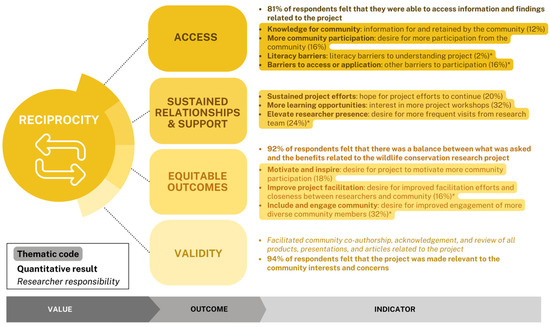 Figure 8. Evaluation indicators of outcomes related to the value of reciprocity. The four potential outcomes arising from the core value of reciprocity, as presented in the Relational Science Model. Thematic codes (in bold and highlighted) are binned by each of the outcome criteria, including brief descriptions and the proportion of respondents who mentioned each thematic code in parentheses. Asterisks (*) denote codes that infer a critique or area of improvement within the project (Table S2). Included, where relevant, are complementary quantitative results (in bold with no background, from Figure 2) and external researcher responsibilities (italicized).