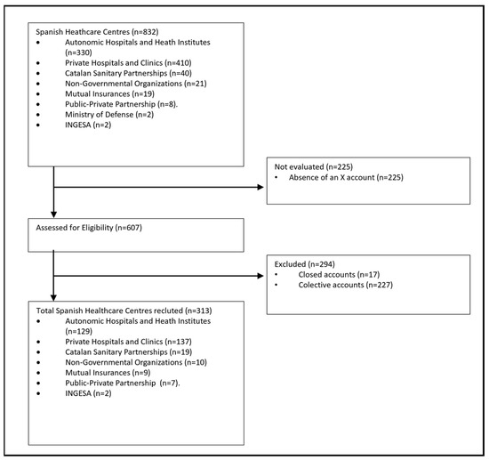 A total of 832 Health Centers in Spain were analyzed, of which 330 (39.66%) belonged to Health Services and Institutes of the Autonomous Communities and 410 (49.28%) belonged to Private Centers or Hospitals. Of the total, 225 centers were not evaluated because they did not present accounts in X, with 607 centers being readable, and of these, 294 were excluded because their accounts were closed or because they were collective accounts (Figure 1).