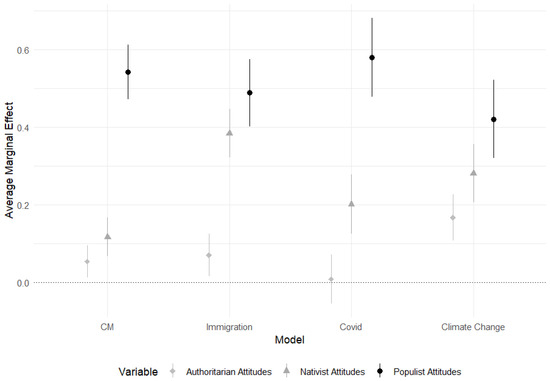 Average marginal effects—populism, nativism, authoritarianism. Note: Average marginal effects using robust standard errors plotted with the “marginaleffects” (Arel-Bundock et al. forthcoming) and “ggplot2” (Wickham 2016) packages in R.