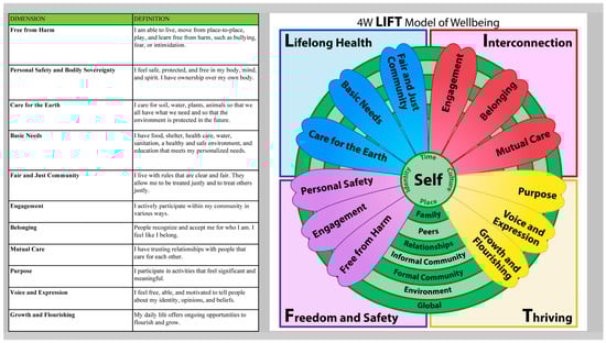 The 4W LIFT (lifelong health; interconnection; freedom and safety; and thriving) Model recognizes multiple dimensions of wellbeing, which enable people to sense and express more specific and contextualized understandings of their lived experiences. These dimensions have been shaped by the voices of women and children in a variety of contexts in multiple countries around the world (DiPrete Brown and Bintliff 2024, p. 6).