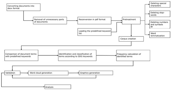 Step 3 was corpus creation. A corpus of data was created, including the documents to be analyzed and the list of keywords relating to the SDGs. This step structured the data for efficient analysis, focusing on linguistic features and relevant language structures.