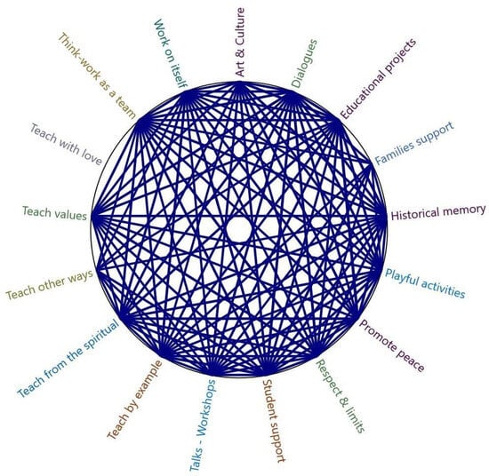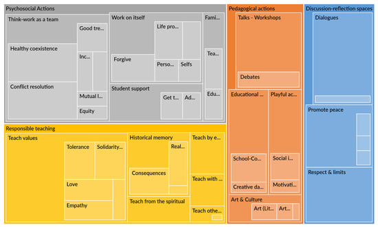 Building on this foundation, incorporating spirituality into teaching practice not only enriches the teacher–student relationship but also manifests in specific actions that educators employ to establish a peaceful classroom environment. Drawing on data collected through interviews, workshops, and focus groups, we employed NVivo software (version 14) to conduct cluster analysis—a multivariate statistical technique that enabled us to categorise teaching actions based on their homogeneity (see Figure 1). This descriptive approach facilitated the identification of key actions prioritised by educators in their peacebuilding efforts, revealing four primary categories: (1) psychosocial actions, (2) responsible teaching practices, (3) pedagogical actions, and (4) spaces for discussion and reflection. All codes depicted in Figure 1 belong to one of the aforementioned categories. By integrating spirituality into this analysis, we can observe how educators’ beliefs not only influence their internal motivation but also shape the structure of their teaching and the cultivation of a peace-promoting environment, reinforcing the importance of considering these elements in the development of effective educational practices.