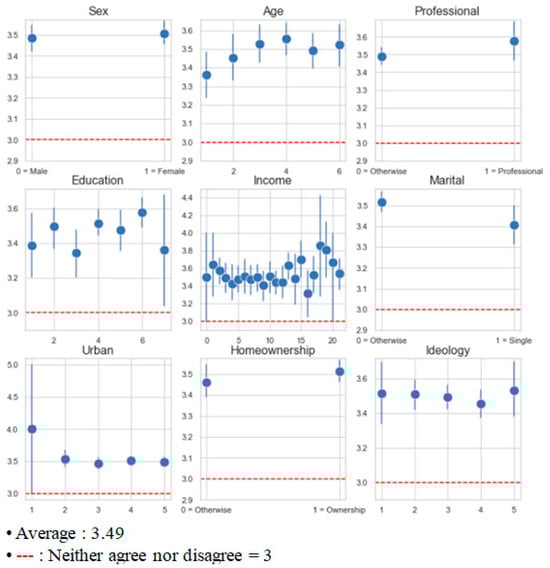 Demographic variables such as age, sex, education, marital status, professional occupation, urban residency, and political ideology (see Table A3 in Appendix A for details) are also considered to analyze patterns in public perceptions of elite alignment with public needs. The findings, illustrated in Figure 1, indicate that across various groups, all variables maintain an average score ranging approximately between 3.5 and 4. A score of 3 represents a neutral position, manifesting neither strong disagreement nor agreement with the question. Scores above this threshold suggest a tendency among respondents to agree, albeit moderately, with the idea that the disparity in viewpoints between political elites and the general public is more pronounced than the differences within the public’s own perspectives. These findings, therefore, imply a prevalent belief among the populace that politicians are not entirely in tune with or understanding of the public’s perceptions and concerns.
