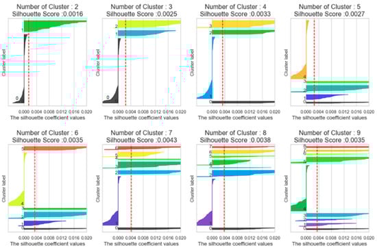 K-means++ clustering is then applied to the TF-IDF results to assign cluster values to each member of Congress. K-means++ is a distance-based clustering algorithm developed from K-means, with its core principles being identical except for cluster centroid initialization (; ). K-means is recognized as an unsupervised learning method, whereby it selects a cluster centroid and then the data closest to the centroid based on the Euclidean distance (). To measure the efficiency of clustering, this study utilizes the Silhouette Score, and the highest score indicates the most efficient clustering (). Figure 2 displays the results of the clustering analysis, indicating that the entire population clusters most efficiently when divided into seven clusters (Silhouette Score = 0.0043). Then, an experience variable isnewly created by assigning the clustering outcome to each member of Congress.