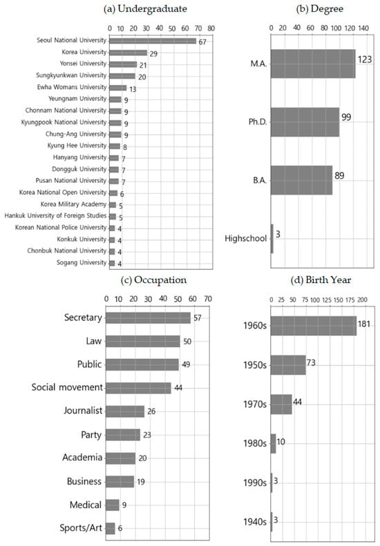 Figure 4 and Figure 5 illustrate the demographic and socio-economic characteristics of Korean lawmakers, offering valuable context that complements the results of the social network analysis (SNA). In Figure 4a, this analysis reveals a concentrated educational background among legislators, with Seoul National University as the most represented institution, contributing 67 graduates. Following this, Korea University accounts for 29 graduates, Yonsei University accounts for 21, Sungkyunkwan University accounts for 20, and Ewha Womans University accounts for 13. Together, Seoul National University, Korea University, and Yonsei University—collectively known as the ‘SKY’ universities—constitute 37% of all lawmakers, highlighting the concentration of elite educational attainment within the National Assembly.