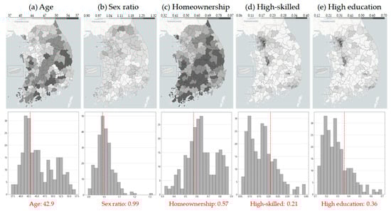 Figure 6 presents the socio-economic and demographic characteristics of the general population, enabling comparative analysis through the use of district-level data. Nationally, in Figure 6a, the average age is generally distributed within the 40s, with higher averages in rural “gun” units, where it can reach up to 57. In Figure 6b, the sex ratio (men/women) ranges between 0.9 and 1.3, with a national average of 0.99, indicating a slightly higher female population. In Figure 6c, homeownership is substantially lower in metropolitan areas, at around 30%, but is higher in rural areas, with a national average of approximately 57%. In Figure 6d, higher-skilled employment—defined by ISCO as managerial and professional roles—is predominantly concentrated in metropolitan areas, while in rural areas, professional employment rates range between 10% and 15%. In Figure 6e, educational attainment shows a similar disparity, with 40% of individuals in urban areas holding a four-year degree or higher, compared to only 20–30% in rural areas.