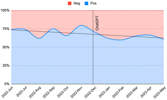 Before diving into the results of our AI anxiety index to answer our research question, it is worth following the strategy of previous studies and examining the evolution of sentiment towards AI in our corpus. Two major trends emerged. The first is a clear dominance of positive versus negative headlines, both before and after the launch of ChatGPT. This confirms the results of previous studies mentioned in the Section 1.1. Second, the proportion of headlines with negative emotion increased after the launch of ChatGPT. Figure 2 shows these trends according to the sentiment analysis conducted with the Hugging Face model.