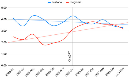Figure 3 shows this development month by month and grouped by type of outlet. The index remained quite stable for national outlets, with regular fluctuations that look like clickbait cycles of topics discovered, exploited, and soon forgotten. Regional media showed lower AI anxiety than national media with similar curves until the end of November, when ChatGPT was presented and this parallel development abruptly changed; while the index tended to stabilize in national outlets after this date, the regionals presented sharper and continuous growth until they surpassed national media in February. Overall, the trend in AI anxiety over the year moved slightly downwards in the group of five national outlets and upwards for the five regional outlets. Both started to decline in March.