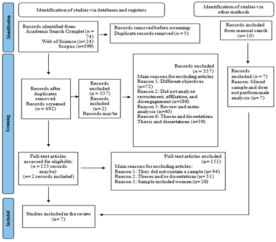 The present systematic review was conducted according to the Preferred Reporting Items for Systematic Reviews and Meta-Analyses (PRISMA) guidelines (Moher et al. 2009). Only the studies that utilized empirical methodology and complied with the PICOS strategy (Participants, Intervention/Exposure, Comparison, Outcome, and Study Design) were included in this systematic review. Thus, the studies that directly examined the process of recruitment, affiliation, and disengagement from terrorist groups in men were included.