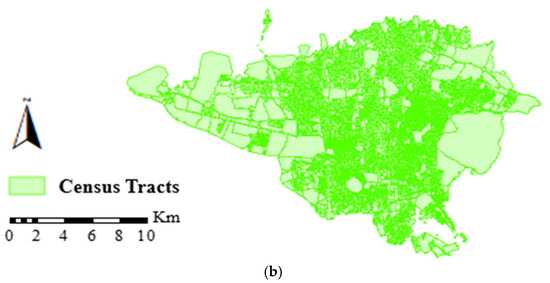 This study utilizes data from the 2006 census of Tehran at the census tract level. The census recorded 90,057 Afghan immigrants. The detailed demographic information, including the gender distribution of Afghan immigrants, provides a nuanced understanding of the city’s population. According to the 2006 census, Tehran comprises 22 urban districts (Figure 1a) and 4334 census tracts (Figure 1b). The most significant feature of the city is the north–south spatial inequality. The north of Tehran, at the foot of the Alborz Mountain range, enjoys better economic and social conditions, where the wealthy reside. In contrast, the southern part faces challenges, such as high population density, poverty, low access to urban facilities and services, and environmental pollution.
