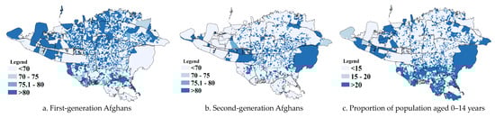 The spatial distribution of first- and second-generation immigrants across Tehran indicates notable differences in their residential areas. While first-generation Afghan immigrants are more prevalent in the northern and southern parts of Tehran, they are dispersed across all geographical levels of the census tracts. One significant reason for the presence of first-generation Afghans in affluent areas in the north of Tehran (Districts 1, 2, 3, and 5) is employment opportunities as custodians and guards in exchange for housing. In contrast, most second-generation Afghan immigrants reside in the central and western parts of Tehran, where social and economic conditions are more favorable. (See Figure 3a,b).