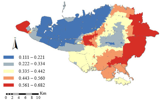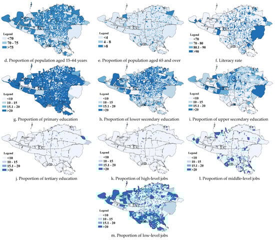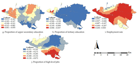 According to Figure 3, in most areas where Afghan immigrants reside, less than 20% possess an upper secondary education. However, in some northern parts of Tehran, approximately 20–25% of immigrants have completed upper secondary education. Regarding spatial distribution, most immigrants with tertiary education are concentrated in the northern regions of Tehran. Those with tertiary education exhibit a clustered spatial pattern. As a result, immigrants tend to relocate as their educational level increases. For example, most Afghan immigrants with tertiary education reside in Districts 2, 3, and 6, which are considered developed and privileged (Figure 3j).