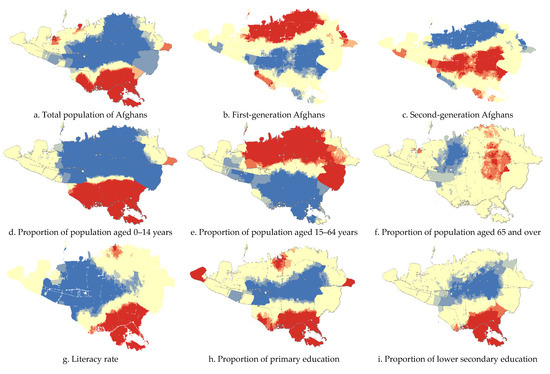 Figure 3 illustrates the spatial distribution of Afghan immigrants based on various variables at the census tract level in Tehran. The highest number of Afghan immigrants is located in the southern part of the city. The spatial distribution pattern of first- and second-generation Afghan immigrants in Tehran is clustered. The southern areas of the city have underdeveloped socioeconomic structures and urban infrastructure. Due to the deteriorating fabric of these areas, it is easier for individuals to form kinship networks, live in clusters, and avoid paying upfront housing costs.