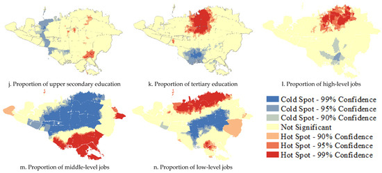 Hot spots in the southern areas suggest a high concentration of characteristics such as children, active workforce, and literate individuals. In contrast, cold spots in the northern and central areas indicate lower levels of these characteristics. Additionally, spatial disparities across Tehran regarding job opportunities for Afghan immigrants are evident, which could result from socio-economic factors and housing and employment policies in these regions (Figure 4).