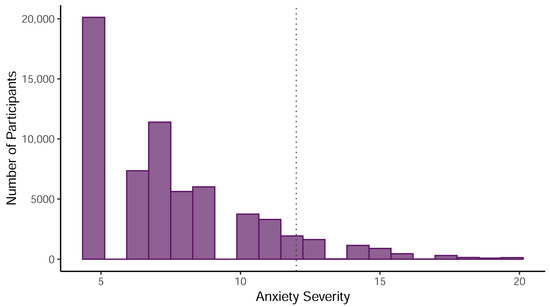 Distribution of composite anxiety scores (based on five items, each scaled from 1 to 4; higher levels = greater severity). The dotted vertical line shows the threshold for severe anxiety symptoms (≥12).